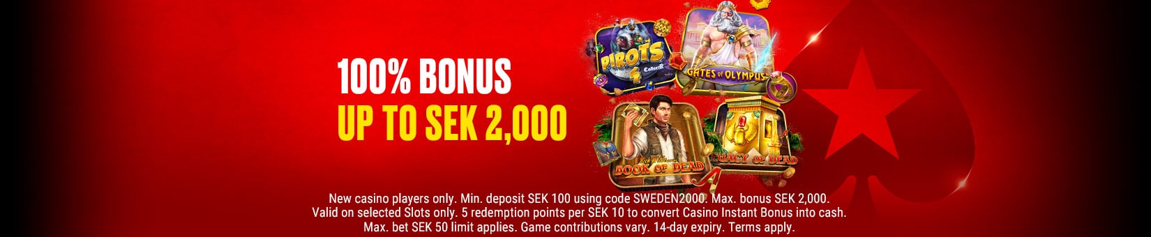 To be eligible for this offer, players must deposit SEK 100 or more using the deposit code SWEDEN2000. Maximum qualifying deposit is SEK 2,000.